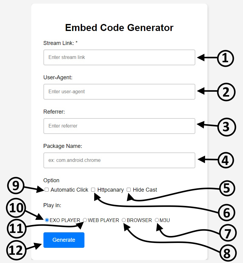 1. Stream Link or Live Stream URL: Enter the link to the video or live stream you want to embed here.